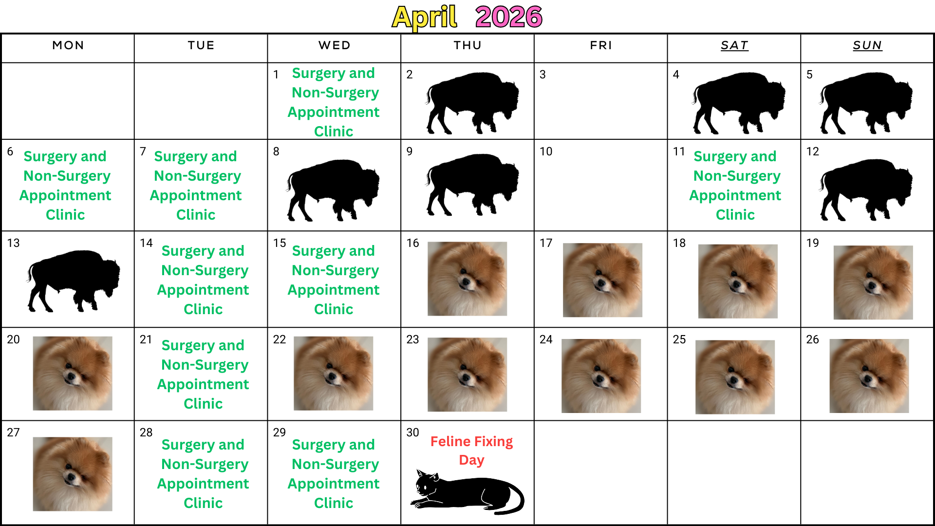 *We are a by appointment-only clinic unless a walk-in day is specified on the calendar above.  Please call from 9 – 10 am on open days to check for day-of-appointment openings due to cancellations.